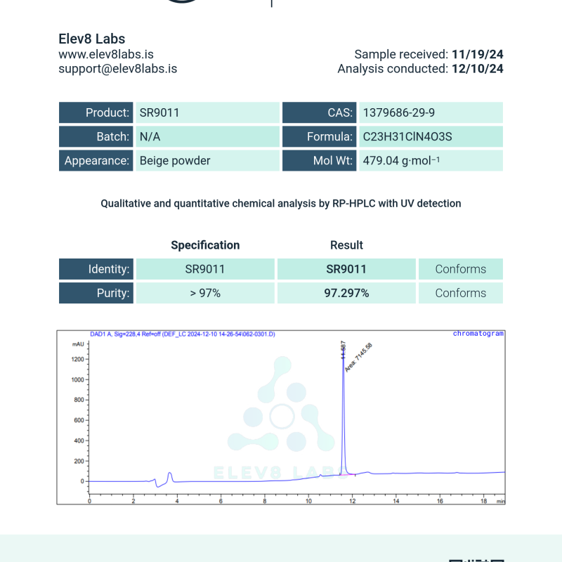 High-purity SR9011 for research use. Studied for fat loss, endurance, circadian rhythm regulation, and mitochondrial function. Third-party tested.