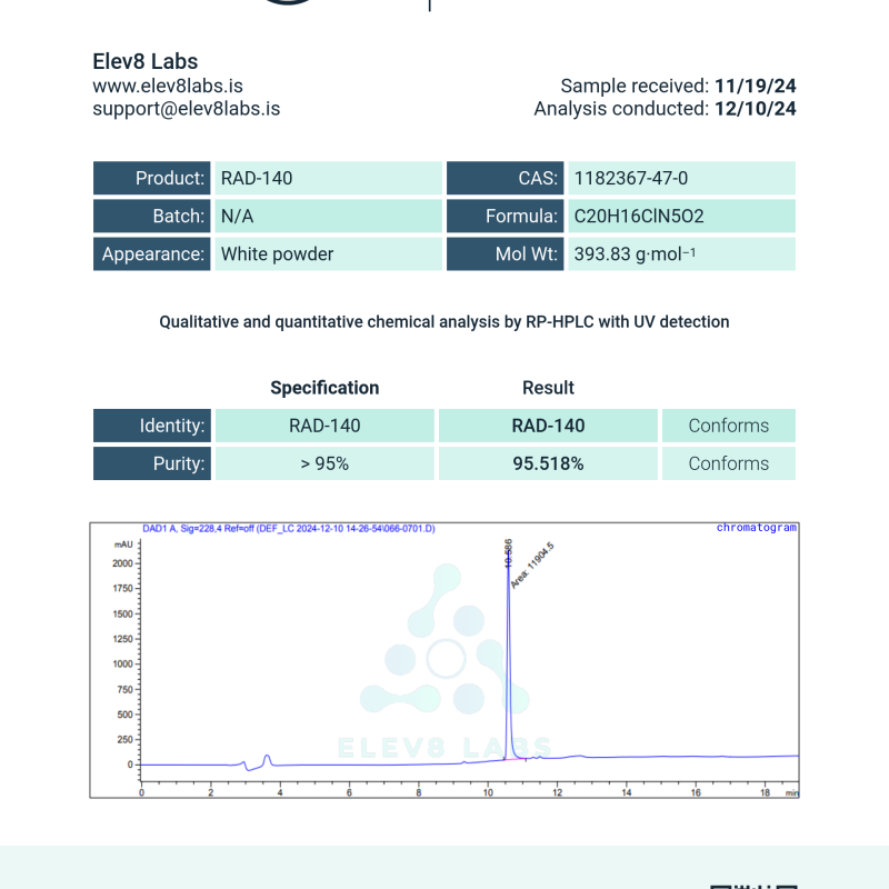 High-purity RAD140 in liquid form for research use. Studied for muscle growth, neuroprotection, and androgen receptor selectivity. Third-party tested.